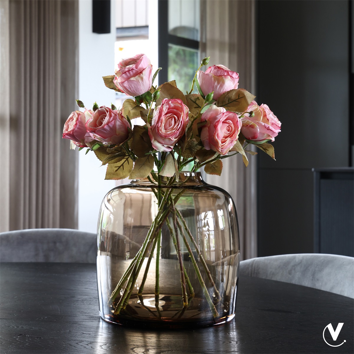 Deze robuuste en tegelijk elegante vaas heeft een ronde, bijna vierkante vorm en is perfect voor een grote bos bloemen. Dankzij de brede, platte onderkant staat hij stevig op elke tafel, dressoir, sidetable of kookeiland. Het zware, dikke glas geeft de vaas een luxe uitstraling met een subtiele glans.